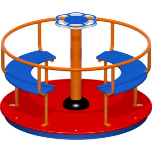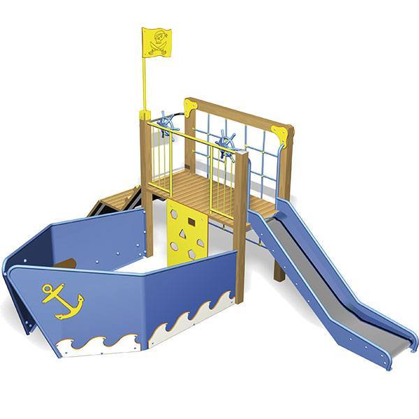Juego compacto con forma de barquito compuesto por un tobogán, rampa para subir al juego, una plataforma, banco para sentarse en la proa del barquito, red para trepar, elemento de escalada y dos timones para conducir el barco.