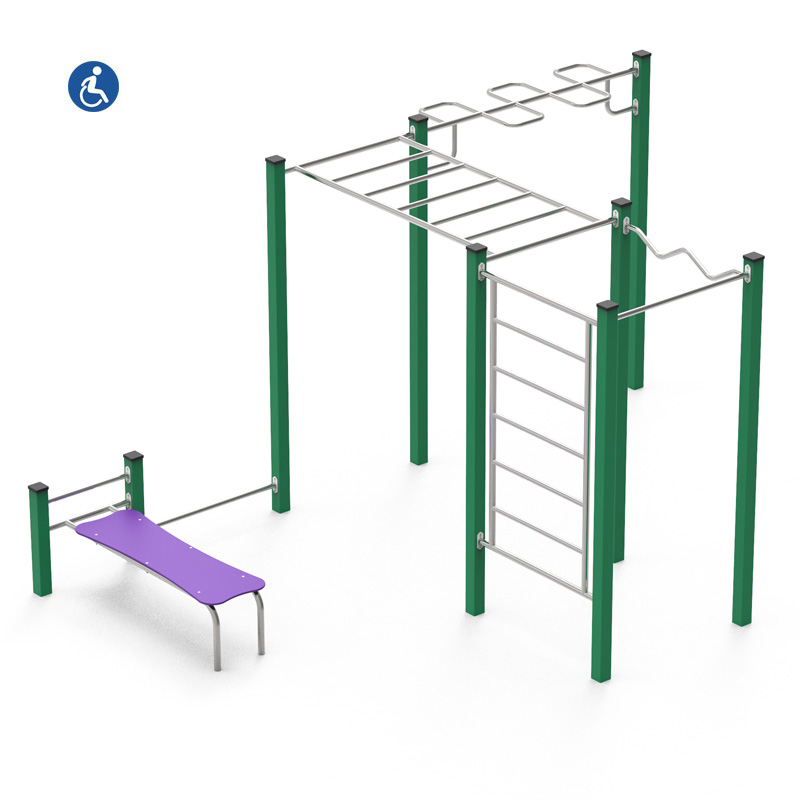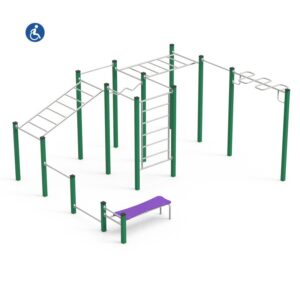 Composición formada por 9 postes verticales con los siguientes puestos de ejercicio: Banco de abdominales (Horizontal), Barras de dominadas (Horizontal y “Z”),